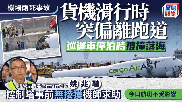 今(20日)凌晨約4時,一架由杜拜來港的波音744貨機,懷疑在香港國際機場北跑道衝落海,期間撞到一輛正在於跑道上巡邏的機管局巡邏車,巡邏車連人帶車被撞落海,車上的男乘客當場身亡,而男司機則重創送院搶救後亦不治。貨機上四名機組人員沒有受傷,機管局於今早10時會見傳媒並交代最新情況,《星島頭條》將現場直播。機管局:黑盒仍在搜索中 待調查完成才能打撈【10:25】機管局表示,黑盒仍在搜索中,機組人員現時還在醫院,會等他們穩定下來才展開更詳細調查。至於何時才能打撈機身,機管局稱已聯絡航空公司和飛機的擁有者,他們正趕來香港,當他們抵港後會與他們商量如何盡快移走飛機,因為飛機的擁有權屬航空公司或者飛機擁有者。機管局指現時最重要是在拯救完成後進行意外調查,待搜證和調查完成後,會盡快決定如何處理飛機,然後移走。控制塔事發前無收涉事貨機求助 空管人員嘗試聯絡機師惟無回覆【10:20】機管局表示,事發前,控制塔無收到涉事貨機的求救信號。消防稱,抵達現場時見到4名機師打開機艙門等待救援,而兩名保安人員在40分鐘後,離岸五米、深7米的水底被找回。機管局稱,控制塔事發前無收到涉事貨機要求協助或求救,飛機在滑行至跑道中間時突然偏離跑道,空管人員嘗試聯絡機師惟無回覆。【10:15】機管局強調,巡邏車並無離開其位置進入跑道,而是涉事貨機衝出跑道撞到巡邏車。【10:00】機管局代表表示,今早晨時3時53分,一架阿聯酋航空由杜拜來港的波音744貨機,懷疑在香港國際機場北跑道降落機場北跑時滑出跑道,繼而衝爛鐵絲網然後墮海,很不幸當時機場保安公司的一架巡邏車都在上述位置,飛機將巡邏車撞落海。機管局:事發時天氣及跑道適合運作機上4名機組人員被救出,2名機場保安公司員工分別在現場和醫院離世,2人分別在機場服務7年和12年,機管局對於兩個員工離世,深表歉意。機管局會配合調查,並為會死者家屬提供適切協助。機管局又指,事發時天氣及跑道適合運作。今日約千航班升降將以南和中跑道維持正常運作機管局表示,今日預計將有約1,000班航班升降,將以南跑道和中跑道維持正常運作,而北跑道會在移走飛機後才考慮何時重啟。現場貨機最新情況:今晨貨機墮海情況: