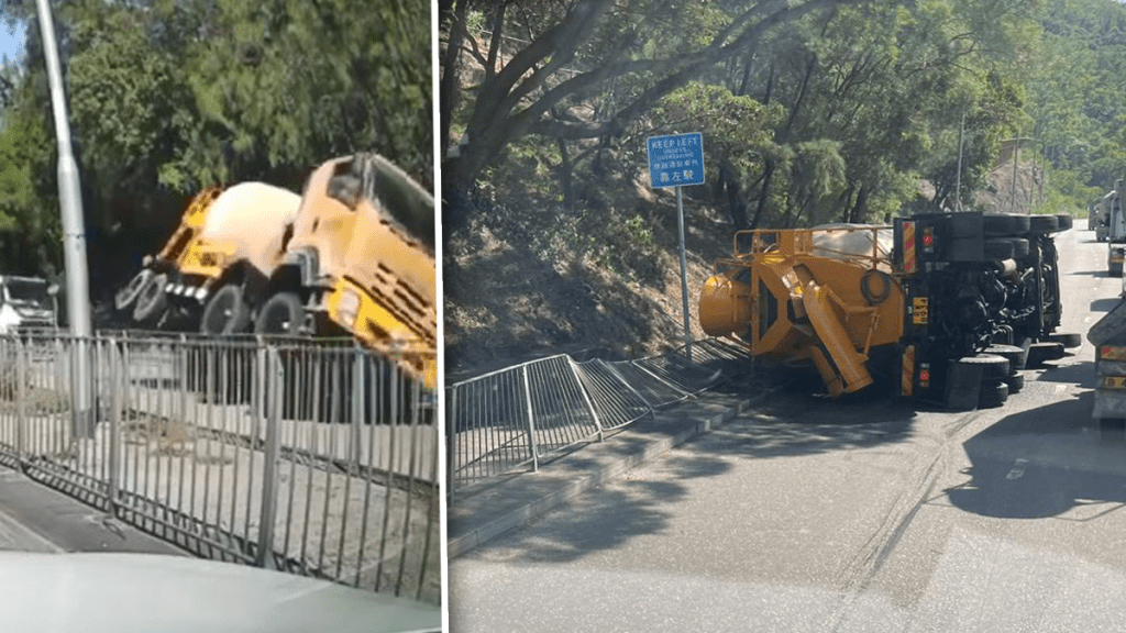 車cam直擊|青衣田螺車轉彎自炒翻側 壓毀鐵欄兼漏油