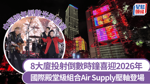 【除夕倒數2026/除夕煙花/跨年/倒數/旅發局】今晚(31日)是除夕夜,因應宏福苑火災,政府取消除夕跨年煙花匯演。旅發局改為在中環遮打道行人專用區舉辦「光影匯.中環」,亦會以巨型倒數時鐘以及光影圖案,與大眾一起倒數,迎接2026年。《星島頭條》全程直擊中環光影匯演現場盛況,與讀者一同邁向新一年!【19:06】港鐵表示,為配合人潮管制措施,中環站「L」、「 J1」、「H」出口封閉,呼籲乘客使用其他出入口。相關車站出入口安排會不時變動,以配合現場情況及最新人流管理安排,大家可留意港鐵 MTR Mobile 的 Traffic News 公佈的最新資訊。【18:00】為配合旅發局跨年倒數活動,中環遮打道一帶開始封路。Air Supply登場表演旅發局早前公布,中環除夕跨年倒數,國際殿堂級組合Air Supply會矚目登場,連同本地歌手馮允謙和雲浩影現場獻唱。同場還有兒童合唱團及警察銀樂隊參與。參與「光影匯.中環」的8幢建築物外牆,亦會以巨型倒數時鐘以及光影圖案,與大眾一起倒數,並上演長約3分鐘,以「新希望、新開始」為主題的光影表演,向現場及全球觀眾送上祝福,一同邁進新一年。日期:2025年12月31日晚上11時30分至2026年1月1日凌晨12時10分地點:中環遮打道行人專用區相關新聞:除夕倒數好去處2026|西九跨年音樂會/迪士尼煙花/中環光影匯演/蘭桂坊 即睇封路及通宵交通安排相關新聞:除夕倒數︱中環行人專用區舉行 燈光匯演取代煙花 不設默哀冀平安心迎接新一年除夕倒數2026交通詳情:港鐵:本地鐵路綫 12月31日(除夕):下午3時起,分階段加密班次,並在其他時段因應乘客需求加強服務。 通宵服務:港島線、荃灣線、觀塘線、將軍澳線(北角至寶琳段及調景嶺至康城段)、南港島線、東涌線、東鐵線(金鐘至上水段)、屯馬線會通宵行駛。東鐵綫 12月31日(除夕):往羅湖及落馬洲站的列車不設通宵服務。 12月31日(除夕):東鐵線往羅湖的尾班車將於元旦日凌晨12時56分由金鐘開出,往金鐘的尾班車則將於凌晨2時30分由羅湖開出。往落馬洲站列車則維持原有服務。機場快綫 12月31日及1月1日:晚上延長服務時間,尾班車較晚由博覽館站開出,便利在亞洲國際博覽館參加活動的乘客。高速鐵路(香港段) 12月20日至1月3日(周末、除夕及部分公眾假期):每日最多加開13對來往「香港西九龍站」及「福田站」的班次。屯馬綫 12月31日(除夕):為配合啟德體育園跨年演唱會,午夜後散場時段將加強服務。輕鐵 12月31日(除夕):7條路綫(505、507、610、614P、615P、706及751)將通宵行駛。港鐵巴士 12月31日(除夕):3條路綫(506、K51及K54A)將延長服務時間。巴士:公共巴士 11條特別巴士路線(九巴第N43、N64P、N71、N243、N272及N276號線;城巴第NB3、R11及R22號線;嶼巴第NB2號線;及過海路線第976S號線)將會於元旦日凌晨提供特別巴士服務。 18條九巴路線、2條嶼巴路線及3條過海巴士路線會加強服務或延長服務時間。 九龍及新界區內有共8條專線小巴路線會延長服務時間 城巴機場快線 A28X 於元旦日(2026年1月1日)加強服務,助將軍澳及日出康城居民前往機場搭早機外遊;城巴深圳灣及香園圍口岸路線亦將提供最密5分鐘的班次服務,更方便乘客跨境出行。跨境巴士 跨境巴士服務營辦商會於元旦日凌晨時段提供往來深圳灣口岸的服務。 落馬洲/皇崗口岸短途跨境巴士服務方面,亦會因應乘客需求情況加強服務。 佐敦至皇崗口岸的短途跨境巴士服務(北行方向)在除夕夜位於中港碼頭巴士總站的中途站點將會延長服務時間至翌日凌晨2時30分。相關新聞:除夕倒數︱羅湖口岸服務時間延至元旦凌晨2時 深圳灣口岸通宵運作羅湖口岸及深圳灣口岸服務時間(一)羅湖口岸(旅客清關服務延長至元旦日凌晨二時) 港鐵東鐵綫會相應延長服務時間,由金鐘往羅湖方向的尾班車會延後至凌晨零時五十六分開出;(二)落馬洲/皇崗口岸(如常24小時通關) 旅客可乘搭港鐵東鐵綫或其他公共交通工具前往上水,轉乘專營巴士第N73號線前往落馬洲(新田)公共運輸交匯處,再乘搭落馬洲—皇崗過境穿梭巴士(皇巴)返回內地; 營辦商亦會加強落馬洲/皇崗口岸短途跨境巴士和皇巴服務,以應對跨境人流高峰;(三)深圳灣口岸(旅客及客車清關服務改為24小時運作) 專營巴士營辦商會於凌晨時段營運第NB2和NB3號兩條特別巴士路線,分別提供往返元朗/天水圍和往返屯門的服務。旅客亦可乘搭港鐵屯馬綫往元朗站/天水圍站和屯門站,分別轉乘第NB2和NB3號線前往深圳灣口岸; 粵港兩地政府亦已增發跨境巴士特別加班配額,以提供通宵服務;及(四)港珠澳大橋香港口岸(如常24小時通關) 有需要時會增加港珠澳大橋穿梭巴士(金巴)的班次。元旦日日間及內地長周末期間(1月1日至4日) 加強口岸穿梭巴士服務,包括增加金巴及皇巴的班次,以配合乘客需求; 加強跨境巴士服務,包括增發一般跨境巴士服務配額,以及加強落馬洲/皇崗口岸短途跨境巴士服務班次; 連接各陸路口岸的本地專營巴士B線的班次亦會提升至高於一般周末的水平,營辦商會預留車輛及人手應對乘客需求;及 港鐵在上述期間的不同時段,會加強東鐵綫來往金鐘至羅湖/落馬洲的列車服務,方便市民和旅客出行。按此即睇封路安排:除夕倒數交通一文睇|港鐵元旦通宵服務 羅湖口岸延至凌晨2時 即睇巴士線特別安排及改動!
