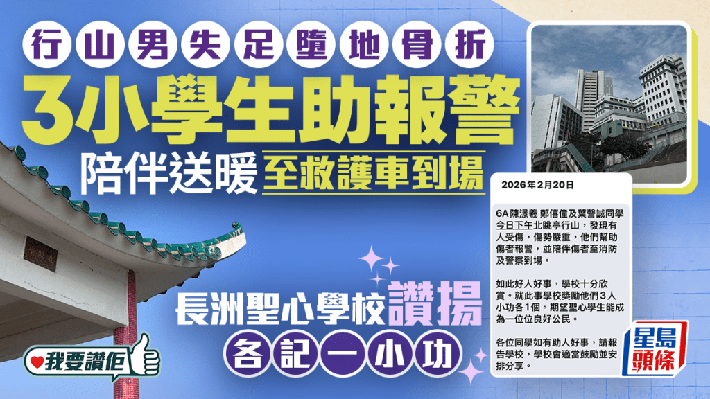 一名男子上周五(20日)在長洲行山時失足墮地受傷,幸得長洲聖心學校3名小學生協助報警並陪伴在側,直至確認傷者安全送上救護車後才離開。傷者家屬事後透過社交平台發文尋人致謝,3名學童的義舉獲校方記功表揚,亦獲網民盛讚。行山男失足墮地 3學童沉着施援有網民在社交平台發文憶述,指其弟上周五下午約4時20分,行至長洲家樂徑北眺亭附近時,不慎失足墮地。他墮地後左手骨折,下巴亦告重創,血流不止,情況一度危急。當時,3名長洲聖心學校學生路過,他們表現冷靜,當機立斷協助報警,並能清晰向警方報告確實位置。在等待救援期間,他們不但送上零食為傷者打氣,更堅持留守,直至確認傷者安全送上救護車後才離開。3人因是次義舉,當晚「返屋企食飯遲咗」。家屬發文尋人致謝 校方記功表揚傷者胞姐在帖文中透露,其弟弟在醫院完成手術後,情況穩定,但「一醒來就不停掛住3位小朋友」,希望能親身向3位「小英雄」致謝,「如果無佢哋果刻嘅幫助同陪伴,後果真係不堪設想。」她亦希望讓學童的父母知道,「佢哋教出嘅小朋友真係好勇敢、好值得驕傲」。傷者事後亦親自回應,衷心感謝3位「小英雄」。他憶述,事發時現場並無他人,幸得3名學童主動援手。他特別讚揚學童表現冷靜,「喺最短時間內清晰咁向消防員同埋報案室報出山上的座標數字」,讓救援人員能迅速鎖定其位置,強調「呢種臨危不亂的反應即使很多成年人都未必能做到」。除了協助報警,3人更陪伴在側並送上紫菜零食,直至他獲救才離開。傷者透露自己已完成手術,正處於康復階段,並再次感謝學童及其家長和學校,稱他們是「香港嘅驕傲」。長洲聖心學校於事發當日已在Facebook發文,指校方在事發當日已得悉事件,並已向3名學生作出表揚,形容事件為「好人好事」,決定各記小功一個,期望學生能成為良好公民。網民對學童的義舉亦讚不絕口,紛紛留言「點解可以咁優秀」、「好人一生平安」。不少人稱讚3名學童「臨危不亂,熱心幫助別人」,更有網民建議應提名他們角逐「好市民獎」,以作嘉許。資料來源:threads