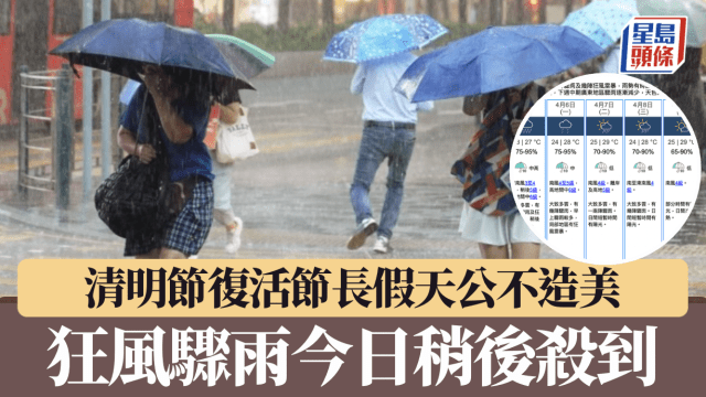 清明節復活節多雨水 今日稍後雨勢頗大兼有狂風雷暴 下周中轉晴