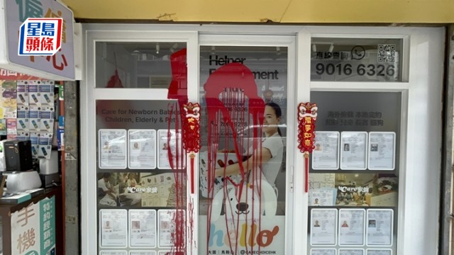 大圍僱傭中心遭淋油刑毀 玻璃大門染紅