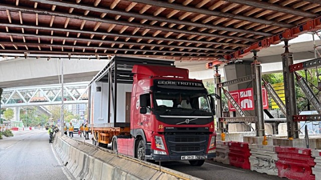 葵涌道拖架運貨過高卡天橋 交通受阻