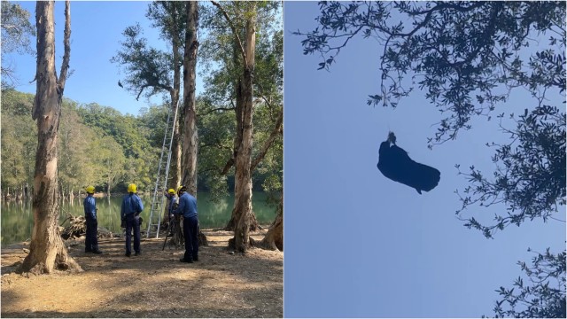 城門水塘烏鴉遭魚鈎纏困樹上 消防員「上山落水」救援 市民讚:世一!
