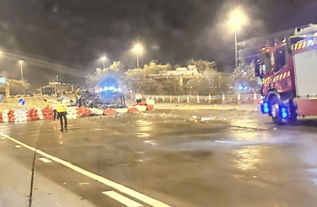 青朗公路近大欖隧道私家車撞水馬翻側 幸無人傷