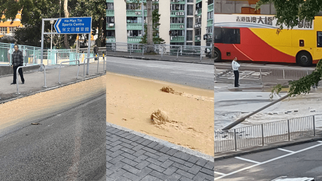 何文田愛民邨再爆水管 黃泥水淹行車線 路面疑下陷沖毀燈柱
