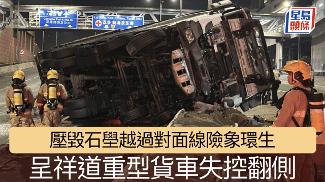 呈祥道重貨翻側 壓毀石壆越過行車線險象環生 司機受困手傷