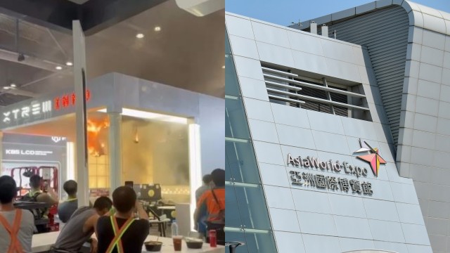亞博館搭建中攤位展板起火 工人淡定圍觀