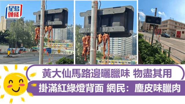 黃大仙馬路邊曬臘味 物盡其用掛滿交通燈背面 網民:塵皮味臘肉|Juicy叮
