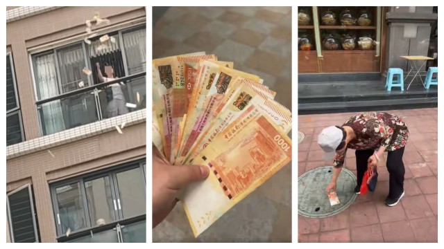 港鈔「金牛」廣東鬧市紛飛 大媽撒錢落街惹途人檢拾 網民:汕頭幣少
