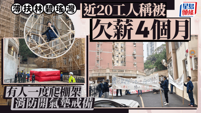 薄扶林碧瑤灣工人爬棚架追薪 稱欠薪4個月涉款數百萬 消防開氣墊
