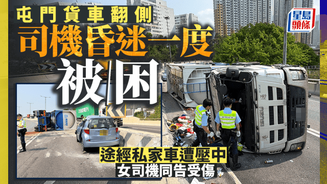 屯門龍富路貨車翻側司機被困 壓向私家車車頂變形 2傷送院