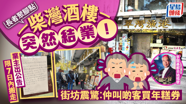 柴灣翠灣漁港酒樓突然結業!長者聚腳點 李龍基曾登台演出 業主出公告限7日內搬走 街坊震驚︰仲叫啲客買年糕券
