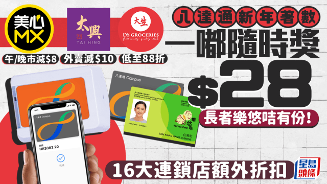 八達通新年一嘟即贏$28回贈!16大餐廳超市額外折扣 美心MX/太興/大生 長者樂悠咭有份!