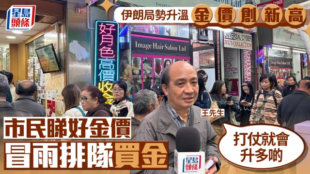 伊朗局勢|戰火推高金價 油麻地金舖人頭湧湧 市民冒雨排隊買金:打仗就會升多啲