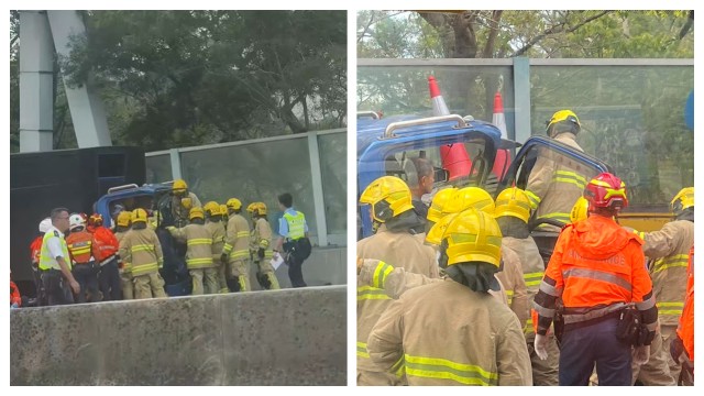 元朗公路貨車猛撼工程車 司機被困獲救