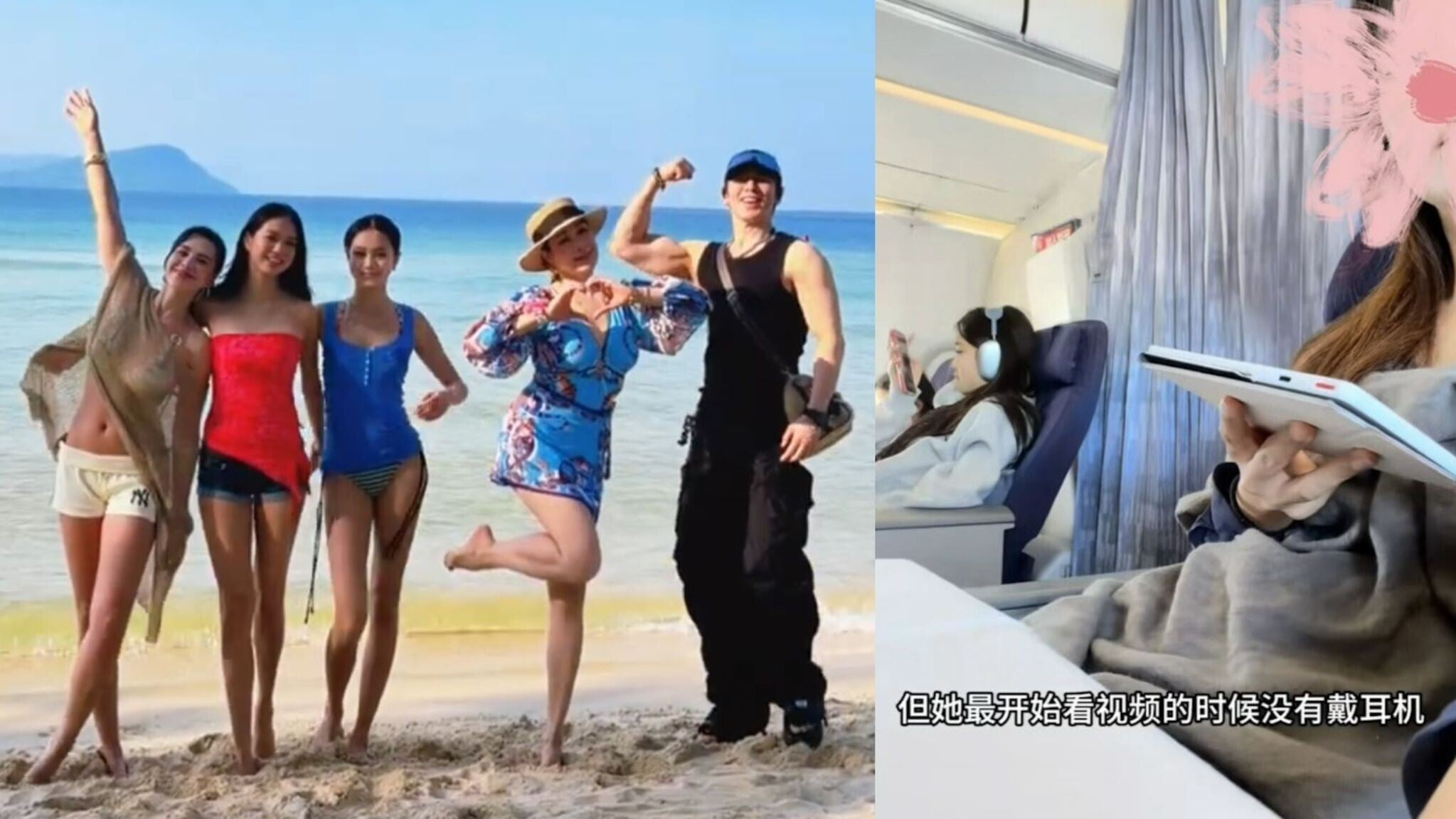 鍾麗緹孖三位寶貝女沙灘打卡騷身材 細女Cayla機艙不戴耳機播片被勸喻