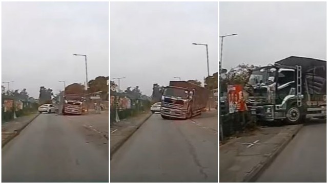 沙田路貨車撞水馬翻側 司機自行脫困