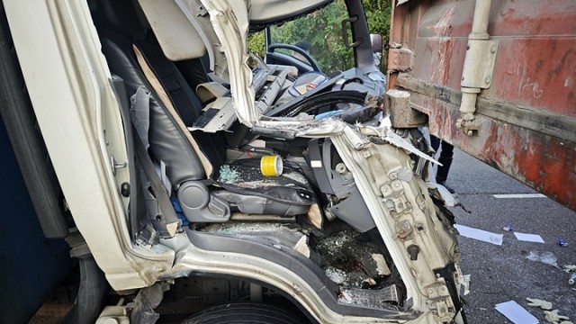 元朗新潭路貨車猛撼貨櫃車「死車」 司機一度被困