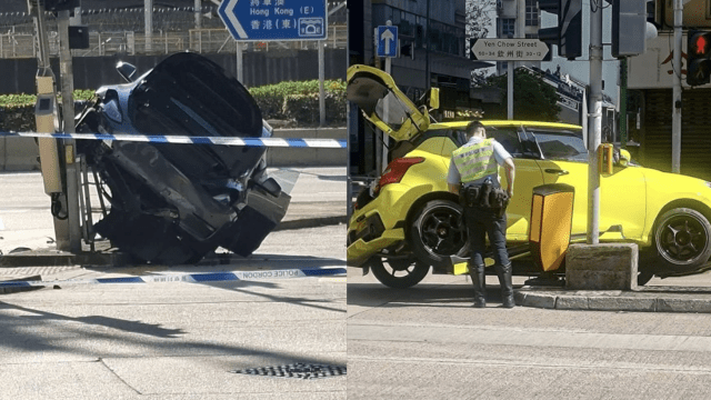 牛頭角Tesla撼燈柱毀8米欄杆 深水埗私家車剷安全島