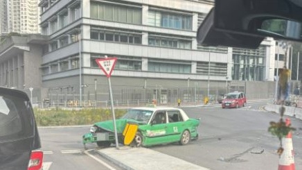 屯門珠海學院對開的士自炒撞燈箱指示牌 司機乘客被困獲救送院